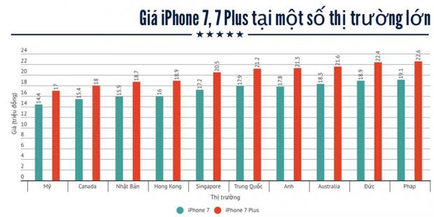 Trong 10 quốc gia mà Apple bán iPhone 7 và iPhone 7 Plus đợt đầu tiên thì Mỹ là thị trường có giá bán thấp nhất ngang với giá đề xuất ở bên trên là 14.4 triệu và 17 triệu còn Pháp lại là thị trường có giá bán cao nhất ở mức 19.1 và 22.6 triệu đồng (tương ứng iPhone 7 và iPhone 7 Plus).