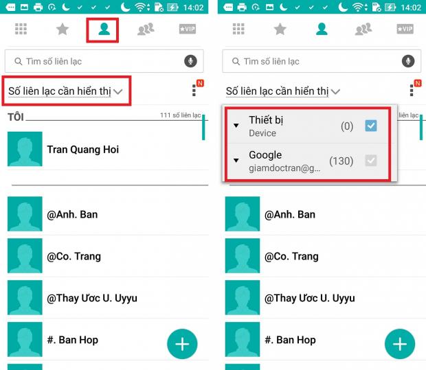 - Vào biểu tượng Danh bạ > Số liên lạc cần hiển thị > Và chọn nguồn bạn cần hiển thị danh bạ.