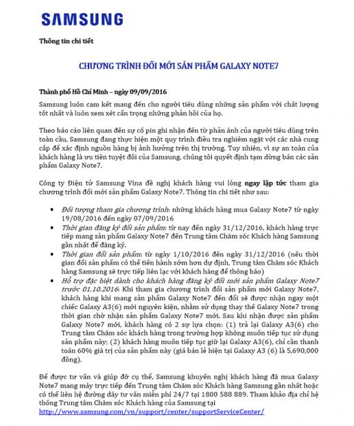 - Hỗ trợ đặc biệt dành cho khách hàng đăng ký đổi mới sản phẩm Galaxy Note7 trước 01.10.2016: Khi tham gia chương trình đổi sản phẩm mới Galaxy Note7, khách hàng khi mang sản phẩm Galaxy Note7 đến đổi sẽ được nhận ngay một chiếc Galaxy A3(6) mới nguyên kiện, nhằm sử dụng thay thế Galaxy Note7 trong thời gian chờ nhận sản phẩm Galaxy Note7 mới. Sau khi nhận được sản phẩm Galaxy Note7 mới, khách hàng có 2 sự lựa chọn: (1) trả lại Galaxy A3(6) cho Trung tâm Chăm sóc khách hàng trong trường hợp không muốn tiếp tục sử dụng sản phẩm này; (2) khách hàng muốn tiếp tục giữ lại Galaxy A3(6), chỉ cần thanh toán 60% giá trị của sản phẩm này (giá bán lẻ hiện tại Galaxy A3 (6) là 5,690,000 đồng).