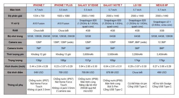 Trong khi chờ đợi hãng công nghệ đến từ Cupertino tiết lộ dung lượng RAM cùng như thời lượng pin chi tiết trên iPhone 7/iPhone 7 Plus, bạn có thể điểm qua những thông tin cấu hình khác của bộ đôi này khi được đặt cạnh loạt flagship mới ra mắt trong thời gian gần đây như Samsung Galaxy S7 edge, Samsung Galaxy Note 7, LG V20 hay chiếc Nexus 6P của Google.