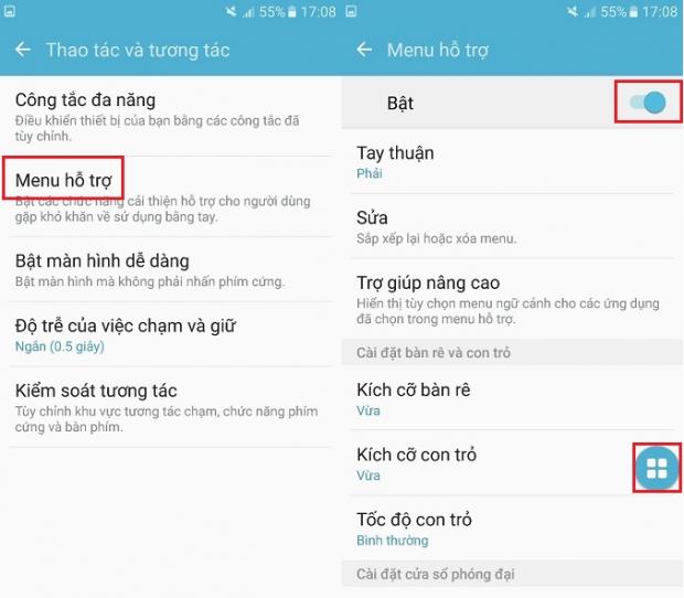 Sau đó, chọn Menu hỗ trợ và bật nó lên. Ngay lập tức trên màn hình sẽ xuất hiện một phím Home ảo dạng hình tròn giống như phím menu trên máy.