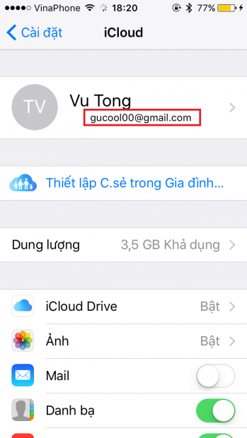 Để xác định được chính xác Email bạn sử dụng để đăng kí iCloud, người dùng vào Settings (Cài đặt) > iCloud