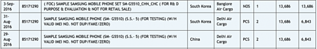 Cụ thể, trên Zauba, Galaxy On5 2016 có tên mã là SM-G5510 và nó đang được thử nghiệm tại đây. Cũng trong danh sách này, SM-G5510 có 4 mẫu được mang đến thử nghiệm, trong đó giá bán mỗi máy được quy đổi là khoảng 100 USD (khoảng 2.2 triệu đồng) tuy nhiên mình nghĩ đây là giá của bản thử nghiệm còn giá bản thương mại thường sẽ cao hơn thế.
