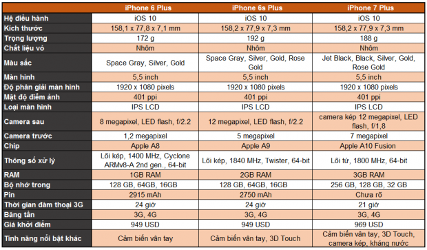 Bảng so sánh cấu hình iPhone 6 Plus, iPhone 6s Plus và iPhone 7 Plus