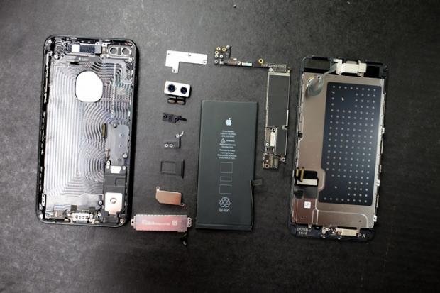 Những thành phần chính của iPhone 7 Plus. Dù thiết kế nhìn vào không thấy quá nhiều khác biệt so với iPhone thế hệ trước, nhưng vì có tính năng chống nước, nên theo lời kỹ thuật viên, chiếc iPhone 7 Plus tốn nhiều thời gian hơn để 'bung' vì được Apple dán keo khá kỹ.