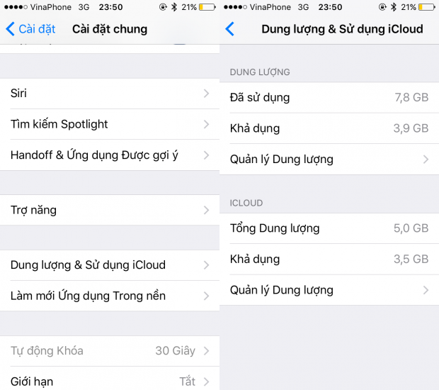 Trước khi xóa ứng dụng, game, ảnh trên iPhone hoặc iPad, bạn nên xem xét kỹ lại bộ nhớ trong của thiết bị mình đang sử dụng, từ đó mới quyết định nên làm gì tiếp. Vào Cài đặt > Cài đặt chung > Dung lượng & sử dụng iCloud > Quản lý dung lượng.