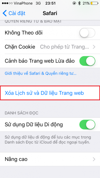 Một cách lấy thêm dung lượng lưu trữ là xóa cache của trình duyệt Safari bằng cách vào Cài đặt > Safari > Xóa lịch sử và dữ liệu trang web
