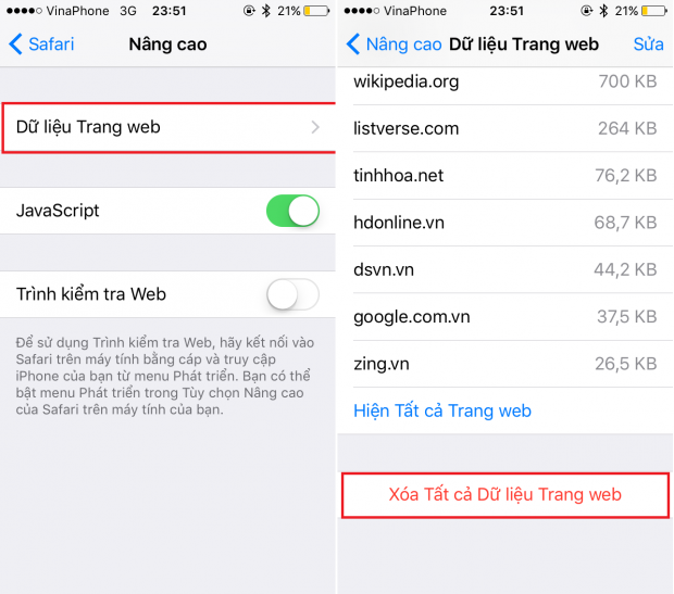 Ngoài ra bạn cũng có thể xóa dữ liệu truy cập vào các trang mạng đã lưu trữ trên thiết bị (không nhiều lắm) bằng cách vào Cài đặt > Safari > Nâng cao > Dữ liệu trang web > Xóa tất cả dữ liệu trang web
