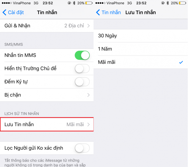 Nếu hay dùng iMessage, dung lượng lưu trữ sau giải phóng có thể lên đến vài GB, hãy xóa bớt những tin nhắn cũ không còn giá trị với bạn. Vào Cài đặt > Tin nhắn chọn ‘Lưu tin nhắn sau đó thiết lập giữ tin nhắn trong 30 ngày hoặc 1 năm