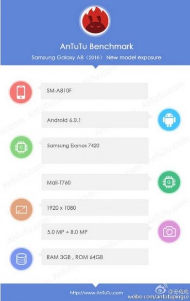 Bắt đầu xuất hiện những tin đồn rò rỉ trong tháng Bảy, đầu tiên là trên GFXBench, Samsung Galaxy A8 (2016) đã khiến không ít người dùng phải mong ngóng nhờ sở hữu những thông số kỹ thuật mạnh mẽ. Đó là một màn hình kích thước lớn 5.7 inch độ phân giải Full HD, chip xử lý tám nhân Exynos 7420 xung nhịp 2.1GHz với 3GB RAM và GPU Mali-760 cho sức mạnh nhanh ngửa với Galaxy Note 5. Cùng với đó là bộ nhớ trong dung lượng 32GB, một camera 16MP ở mặt sau đi kèm một camera 5MP ở mặt trước và được cài sẵn hệ điều hành Android 6.0.1 Marshmallow.