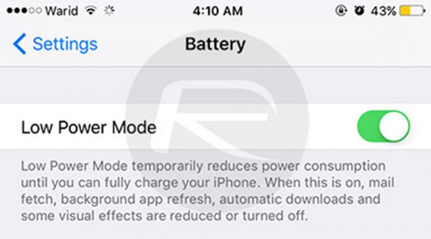 Chế độ tiêu thụ năng lượng thấp rất hữu ích cho người dùng bởi nó sẽ hạn chế việc kết nối mạng, tắt các ứng dụng ngốn pin khi không sử dụng... Truy cập Settings > Battery> Low Power Mode> ON.