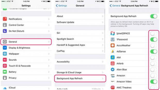 Điều này là tương đối đơn giản. Để ngăn chặn các ứng dụng trên thiết bị liên tục cập nhập các thông báo vừa phiền phức vừa hao pin thì bạn hãy tắt tính năng làm mới ứng dụng nền đi hoặc tắt cho một số ứng dụng không cần thiết. Truy cập Settings > General > Background App Refresh.