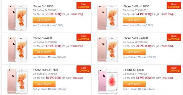 Cụ thể, với iPhone 6s, giảm giá nhẹ nhàng nhất là phiên bản iPhone 6s 16GB, giảm từ 16.99 triệu xuống còn 15.99 triệu đồng. iPhone SE bản 64GB cũng được giảm 1 triệu đồng, còn 13.49 triệu. Giảm mạnh nhất lên tới 3 triệu đồng là 2 phiên bản iPhone 6s, 6s Plus 128 GB (bạn có thể xem hình dưới).