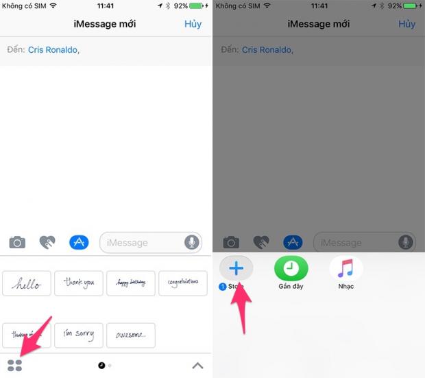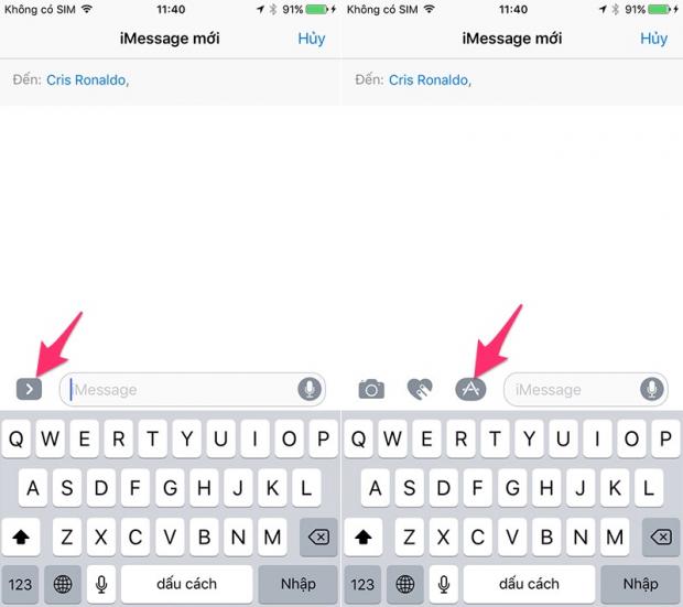 Ngay bên cạnh khung nhập tin nhắn có một biểu tượng hình mũi tên, lúc này sẽ xuất hiện 3 biểu tượng của những tính năng phụ trợ, đó là chèn ảnh, digital touch và Ứng dụng (biểu tượng giống hệt App Store). Bạn hãy bấm vào biểu tượng hình chữ A đấy.