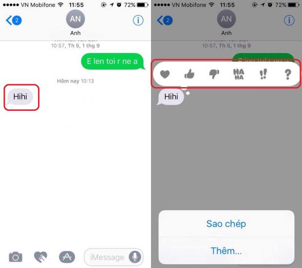 Tapback sẽ hỗ trợ người dùng có thể phản hồi trực tiếp tin nhắn trong iMessage bằng biểu tượng cảm xúc trương tự như Messenger của Facebook. Bạn chỉ cần gửi biểu tượng cảm xúc để người nhận biết mà không cần phải gõ nội dung. Bên cạnh đó, bộ icon cảm xúc emoji cũng có những thay đổi khá nhiều. Để biết cách sử dụng, bạn làm như sau: