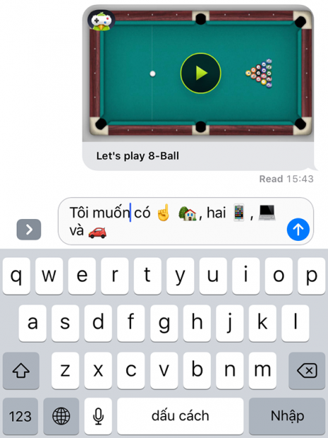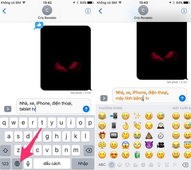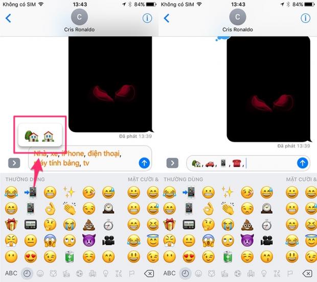 Emoji cũng là một cải tiến làm khá nhiều người dùng thích thú. Chỉ cần nhập tin nhắn như bình thường, sau đó bấm vào biểu tượng quả địa cầu để chuyển sang bàn phím Emoji, khi ấy, toàn bộ những cụm từ nào có thể chuyển thành icon emoji sẽ được tô màu cam.