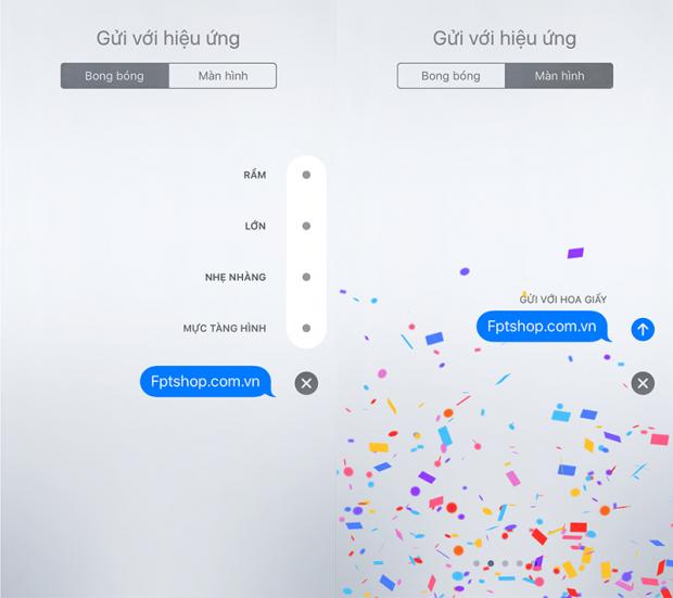 Sẽ có hai lựa chọn: hiệu ứng khung tin nhắn, hoặc hiệu ứng cho cả màn hình như hoa giấy, bong bóng, đèn laser,… rất lung linh và đặc sắc.