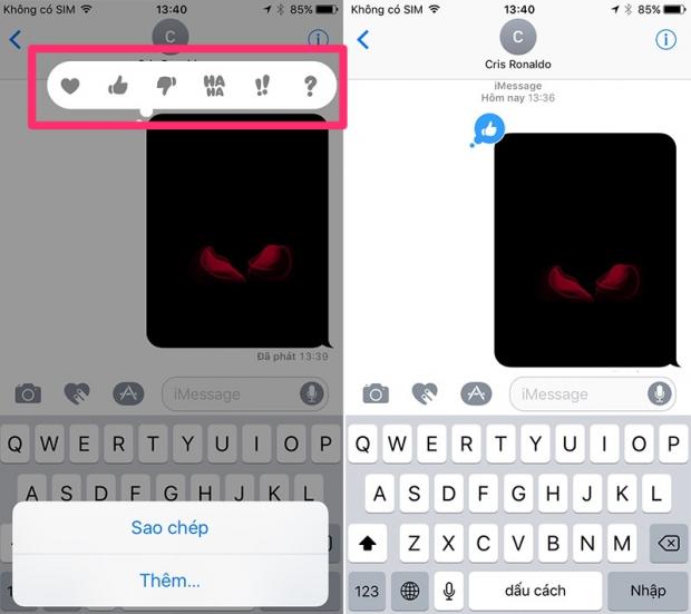 Tiếp theo là tính năng Tapback, ý tưởng của Apple rất giống với các Reactions mới được Facebook ra mắt không bao lâu. Bạn có thể giữ lâu vào một tin nhắn bất kỳ, dù là dạng chữ, hình ảnh hay video để chọn loại phản ứng của mình cho tin đó như: love (trái tim), like (thích), dislike (không thích), haha, dấu chấm cảm như kiểu bất ngờ, cảm thán và dấu chấm hỏi để biểu hiện sự khó hiểu.