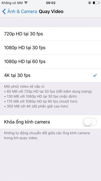 Bản thử nghiệm có tùy chọn quay video 4K 60fpsTrong giao diện tùy chọn độ phân giải khi quay video, Apple cũng đưa ra các mức dung lượng tùy từng độ phân giải khác nhau và với độ phân giải 4K tốc độ 30fps thì mỗi phút sẽ tốn của bạn 350MB dung lượng bộ nhớ nhé.