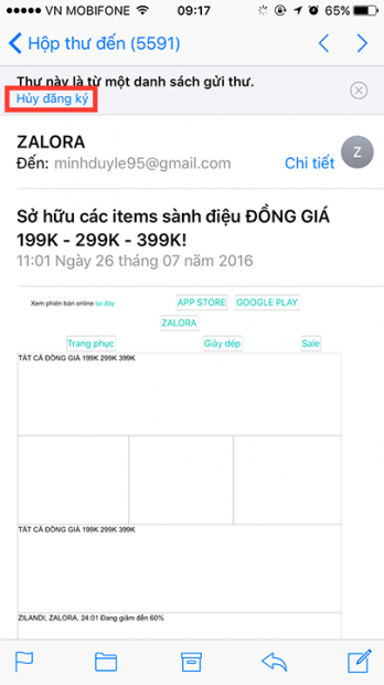 Trong ứng dụng Mail mặc định có trên iOS 10, người dùng có thể unsubcribe (hủy đăng ký) nhanh một email nào có ngay bên trong app. Ví dụ, như trong hình ảnh minh họa bên trên, nếu như không muốn nhận thêm thư cập nhật từ Zalora thì bạn chỉ việc nhấn chọn vào nút 'Hủy đăng ký' nằm ở góc trên bên trái màn hình là xong.