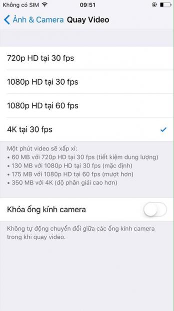 Trong phần cài đặt Camera chúng ta còn có thể lựa chọn chất lượng video phù hợp với nhu cầu sử dụng. Bạn nên hạn chế lựa chọn quay video 4K vì nó khá tốn tài nguyên bộ nhớ trong của bạn.