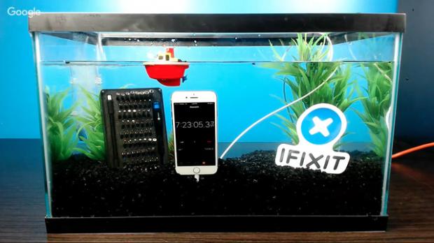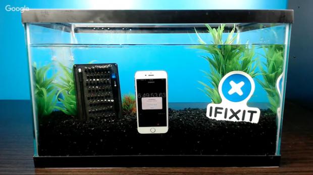Theo đó chiếc iPhone 7 đã được iFixit cho ngâm mình trong bể cá để xác định xem thiết bị này có thể chịu đựng được bao lâu. Một đồng hồ đếm thời gian được chạy từ khi thiết bị được cho vào bể cá, sau thời gian tiêu chuẩn 30 phút thì chiếc iPhone 7 vẫn hoạt động tốt.