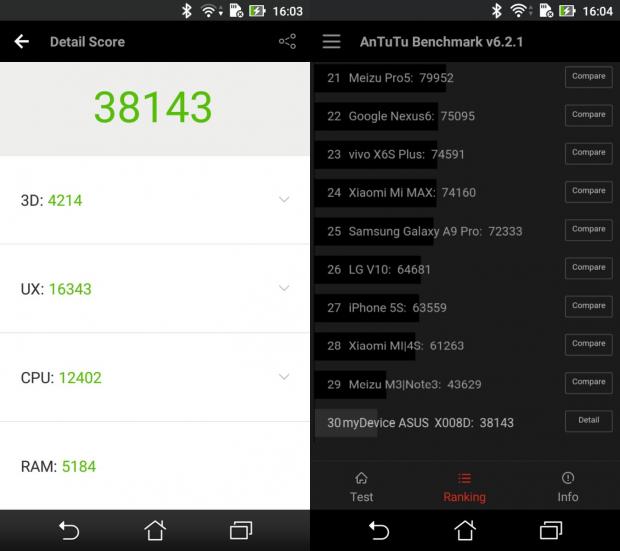 Đầu tiên, với ứng dụng Antutu Benchmark để đo hiệu năng tổng thể, ASUS Zenfone 3 Max đạt được 38143 điểm. Trong đó điểm 3D được 4214 điểm, điểm UX được 16343 điểm, điểm CPU được 12402 điểm và 5184 điểm RAM.