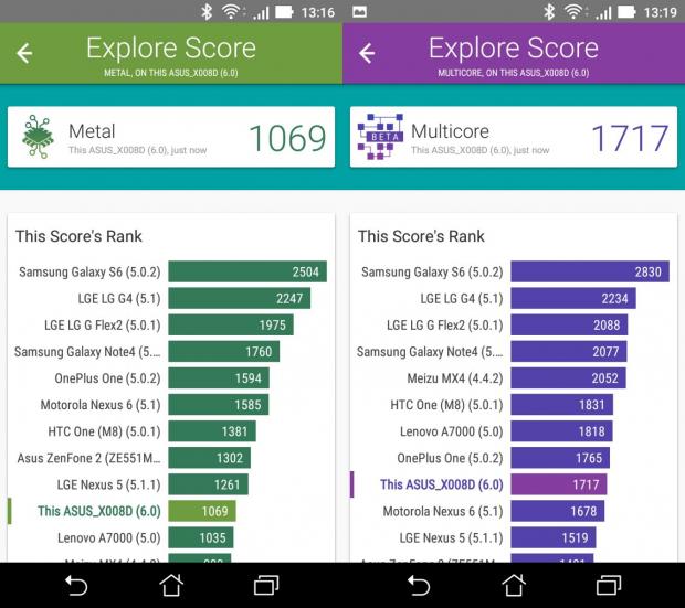 Tiếp theo là ứng dụng Geekbench 3 và Vellamo dùng để đo khả năng xử lý đơn nhân và đa nhân. Với Geekbench 3, ASUS Zenfone 3 Max đạt được điểm số lần lượt là 638 điểm cho đơn nhân và 1693 cho đa nhân. Còn với Vellamo, thiết bị đạt được 1069 điểm đơn nhân và 1717 điểm đa nhân.