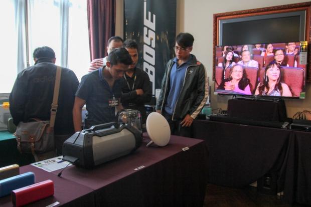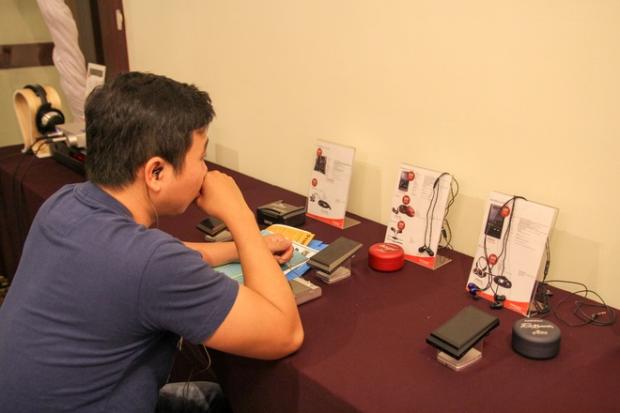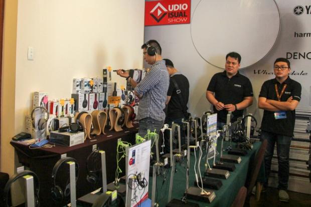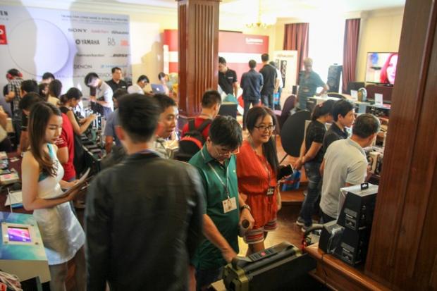 Khu vực trưng bày tai nghe, máy nghe nhạc, loa di động... thu hút rất đông khách trải nghiệm, đặc biệt là những người trẻ. Các thương hiệu âm thanh nổi tiếng quy tụ trong chương trình như Sennheiser, Yamaha, Sony, JBL, V-Moda...