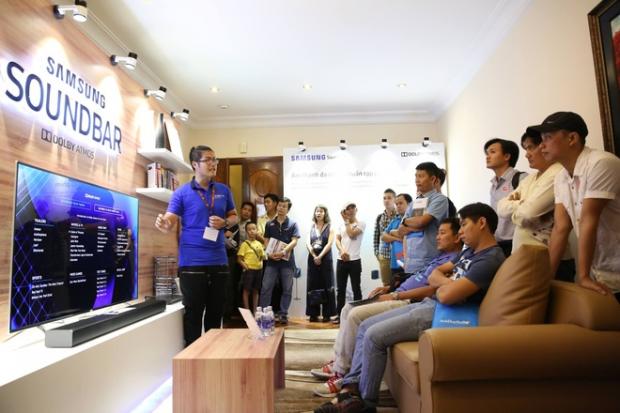 Phòng trưng bày thiết bị âm thanh gia đình cũng chiếm đáng kể quan tâm của khách tham quan. Samsung mang đến các mẫu loa 360 độ, loa không dây và đặc biệt là soundbar K950 hỗ trợ Dolby Atmos. Những model của nhà sản xuất Hàn Quốc có giá từ vài triệu đến khoảng 30 triệu đồng cho soundbar. Ảnh: Nhựt Hùng.' />