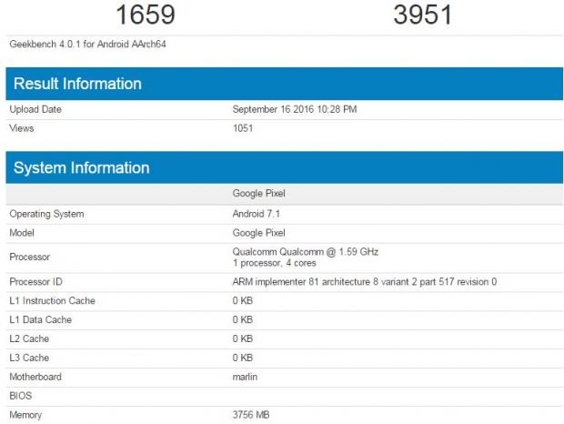Cụ thể hơn, một lần nữa Geekbench xác nhận Pixel XL sẽ trang bị bộ nhớ RAM 4 GB, vi xử lý 4 lõi tốc độ 1.59GHz, rất có thể đây là Snapdragon 820 hoặc 821. Ngoài ra, Geekbench cũng cho thấy Google Pixel XL sẽ chạy trên nền tảng Android 7.1, đúng như những thông tin mà chúng ta được biết gần đây.