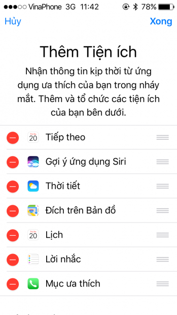 Giao diện điều chỉnh widget có tên Thêm tiện ích xuất hiện. Bây giờ bạn đã có thể loại bỏ các widget mình thấy không cần thiết bằng cách nhấn vào biểu tượng màu đỏ ở đầu dòng tên widget.