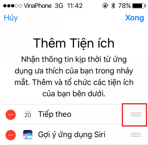 Để sắp xếp các widget hiển thị theo ý muốn ở Lockscreen, bạn hãy nhấn vào biểu tượng 3 gạch ở cuối dòng widget. Giữ và kéo chúng lên xuống vị trí mà bạn muốn.