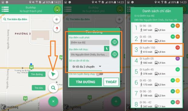 Tại giao diện chính, các bạn chọn vào biểu tượng dấu Cộng (+) phía góc phải. Sau đó chọn tiếp đến Tìm đường. Tiếp đến các bạn nhập địa điểm xuất phát và địa điểm đến rồi chọn Tìm đường. Một danh sách chỉ dẫn gồn đầy đủ các thông tin như quãng đường đi, số xe, sẽ được hiện lên, tùy vào nhu cầu bạn có thể chọn các tuyến đi sao cho phù hợp.