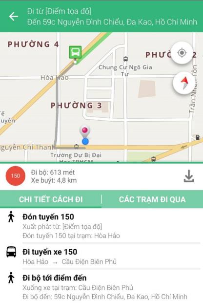 Ví dụ như hình bên dưới, mình chọn địa tuyến xe 150 đến 59C Nguyễn Đình Chiều, sẽ cần phải đi bộ 613m để đến trạm buýt và đi thêm 4.8km xe buýt để đến được địa điểm cuối.