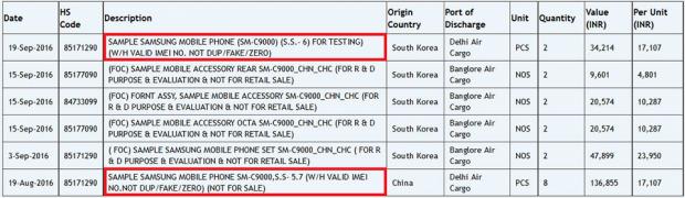 Và dự đoán này hoàn toàn là chính xác khi mà một danh sách xuất nhập khẩu trên dữ liệu của website Zauba của Ấn Độ cho thấy các màn hình thiết bị mã SM-C9000 có kích thước 6 inch. Hai đơn vị được chuyển sang Ấn Độ để thử nghiệm từ Hàn Quốc vào ngày 19 tháng 9. Giá trị mỗi đơn hàng này là 255 USD. Điều thú vị là trước đó một phiên bản của thiết bị mã SM-C9000 đã được vận chuyển từ Trung Quốc sang Ấn Độ lại có màn hình 5.7 inch.