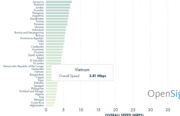 Việt Nam nằm top cuối bảng xếp hạng với tốc độ mạng di động là 3,81 Mbps (Nguồn: Open Signal)Đứng đầu danh sách này là Hàn Quốc (41,34 Mbps), Singapore (31,19 Mbps), Hungary (26,15 Mbps), Úc (25,01 Mbps), Đan Mạch (23,35 Mbps). Quốc gia đứng cuối danh sách là Afganistan(2,17 Mbps).