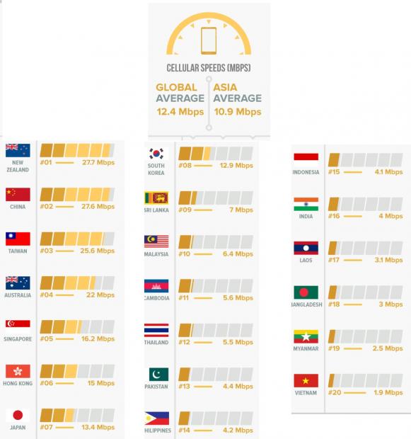 Vào giữa năm ngoái, trang Tech in Asia có đăng tải một bài viết liên quan đến báo cáo đánh giá tốc độ Internet di động của các quốc gia tại khu vực châu Á và thế giới. Theo đó, tốc độ Internet di động trung bình của thế giới là 12,4Mbps, còn tại châu Á là 10,9Mbps. Trong báo cáo, Việt Nam đứng cuối cùng trong khu vực châu Á với tốc độ Internet di động trung bình là 1,9Mbps, tức là còn thấp hơn mức trung bình của khu vực. Tốc độ này còn dưới cả Myanmar (2,5Mbps), Lào (3,1Mbps) và Campuchia (6,4Mbps).