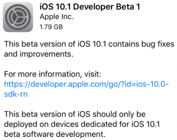 Mới đây, Apple đã tung ra một bản beta mới của hệ điều hành iOS, chỉ chưa đầy 10 ngày từ khi hãng chính thức phát hành iOS 10. Được biết, hiện iOS 10.1 beta 1 đã được đưa ra cho những nhà phát triển đăng kí chương trình thử nghiệm phần mềm. Ngoài ra, phiên bản này cũng áp dụng cho những cá nhân đã tham gia chương trình beta tester.