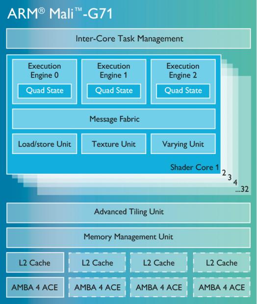 Mali-G71 sử dụng kiến trúc ARM mới gọi là Bifrost, nó cung cấp các chế độ xử lý video độ phân giải 4K và hỗ trợ cho kính thực tế ảo tốt hơn. Nó cũng tương thích với các nền tảng như Vulkan, OpenGL ES 3.2, GPU Compute và Android RenderScript.