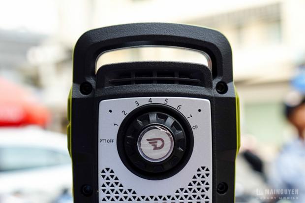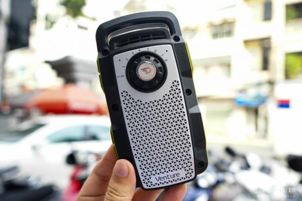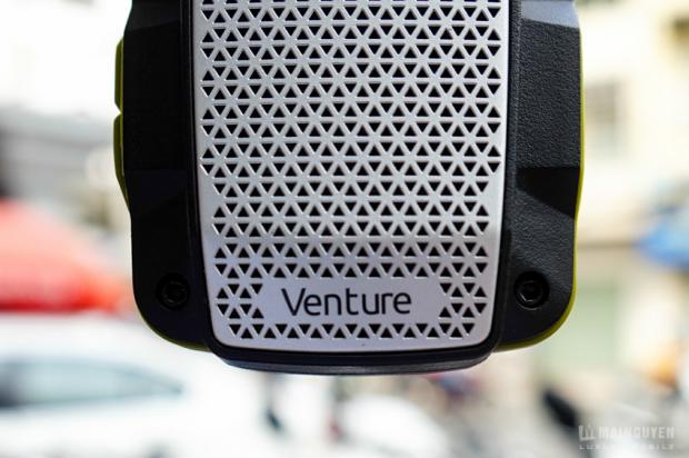 Nguyên mặt trước của loa bao gồm phần trên cùng là một núm xoáy lớn với 8 nấc giúp bạn kết nối mới 8 bộ đàm khác nhau theo từng số. Núm xoay này xoay cực êm và sướng, các nấc được phân chia rõ ràng giúp bạn dễ dàng cảm nhận được thao tác xoay. Ở phần trung tâm là mặt loa to được làm các họa tiết hình tam giác đối xứng và dưới cùng là tên máy: Venture.