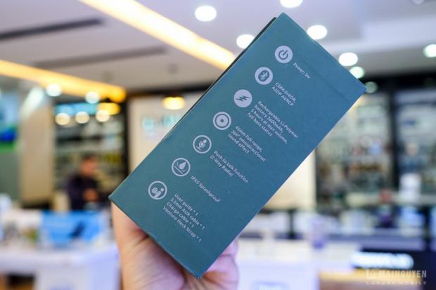 Bên cạnh trái sẽ nơi chứa những thông tin chi tiết như chuẩn Bluetooth CSR 4.0 + EDR, pin 5 giờ chơi nhạc, đàm thoại, âm thanh vòm 360 độ, ...