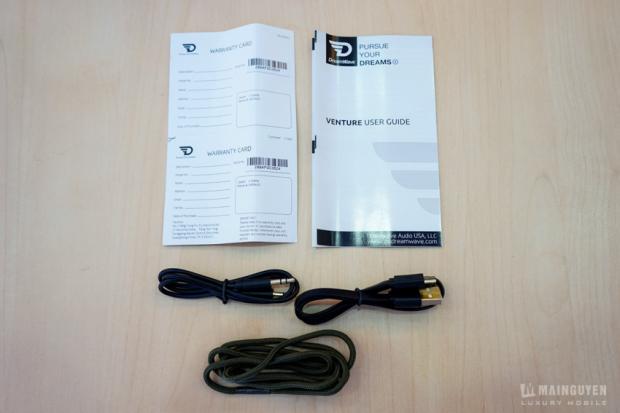 Dưới cùng của hộp sẽ là tất cả các phụ kiện của Venture bao gồm giấy bảo hành, cuốn sách hướng dẫn sử dụng, jack 3.5mm ra 3.5mm, dây Micro USB, và đây đeo của loa được làm màu xanh quân đội giống các dây buộc giày lính cực ngầu và chắc chắn.