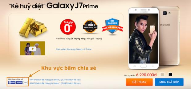 Khu vực bấm chia sẻ của trang thông tin về J7 Prime trên TGDĐBước 4: Chờ quay số may mắn trên random.org. Những người có số may mắn trùng nhau thì người bình luận trước sẽ thắng giải. Trường hợp không có số may mắn phù hợp thì BTC sẽ tiến hành quay số lại.