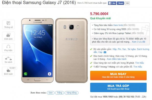 Đứng thứ 2 trong danh sách smartphone bán chạy trong tầm giá 6 triệu tiếp tục là Galaxy J7 2016, sản phẩm có doanh số trong tuần qua là 5.700 chiếc. Máy sở hữu khung nhôm sang trọng, màn hình lớn cùng thỏi pin lên tới 3.300 mAh cho thời gian sử dụng dài cũng là một lựa chọn đáng tiền ở mức 5.8 triệu đồng.