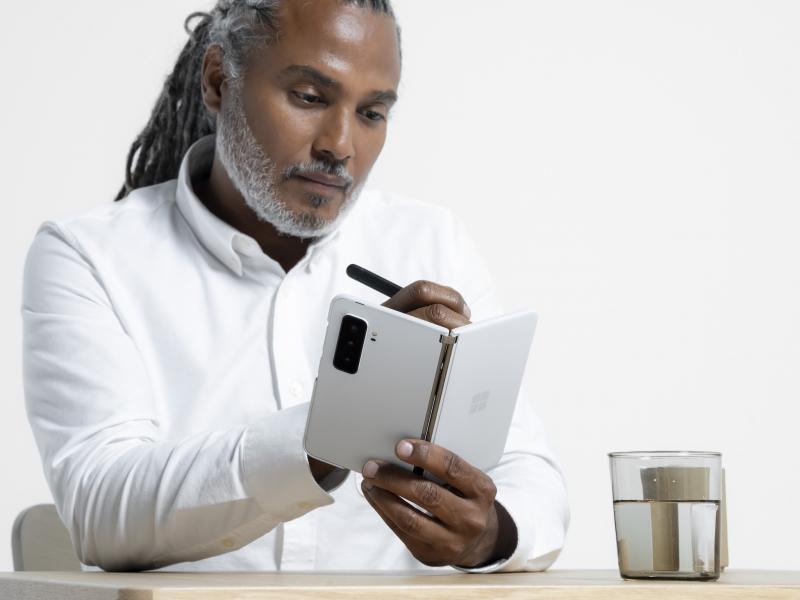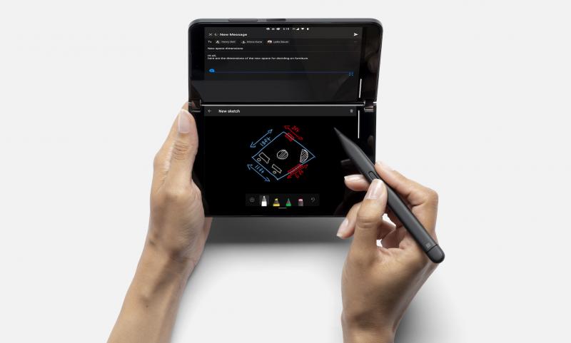 Microsoft trang bị cho máy hai màn hình PixelSense Fusion với kích thước 5'8, kết hợp lại chúng ta có màn hình 8'3, to hơn thế trước một chút. Màn hình này là AMOLED, 401ppi, HDR và DCI-P3, tần số quét 90Hz, cũng như đạt độ sáng 800 nits và được bảo vệ bởi kính Victus.