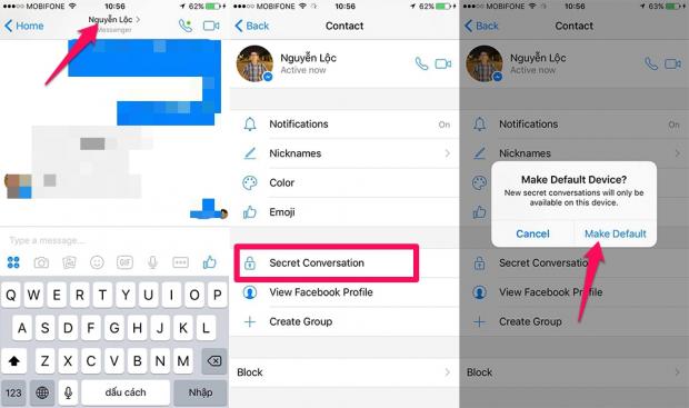 Trên iOS, bạn cần bào khung chat của một người bạn, sau đó chọn vào tên tài khoản ở phía trên màn hình, tiếp theo chọn 'Secret Conversation'. Một cửa sổ thông báo sẽ hiện ra nếu bạn đã sử dụng tính năng này trên một thiết bị khác. Vì cuộc trò chuyện bí mật chỉ dùng được trên một thiết bị duy nhất, nên bạn cần xác nhận đây là thiết bị mặc định thì mới có thể sử dụng.