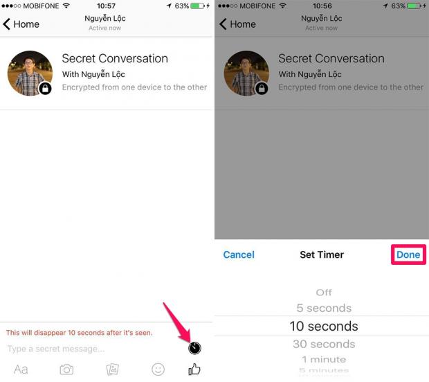 Tiếp theo, để kích hoạt tính năng tự hủy, bạn hãy bấm vào biểu tượng hình chiếc đồng hồ ở góc dưới bên phải màn hình, sau đó chọn mốc thời gian hiển thị trước khi tin nhắn biến mất và chọn 'Done'.