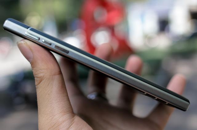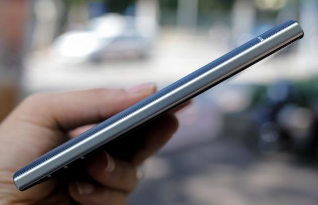 Cạnh trái máy. Máy có khung viền bằng kim loại.