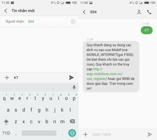 Để kiểm tra loại dịch vụ bạn đang sử dụng hãy soạn tin theo cú pháp KT gửi 994 (miễn phí). Sau vài giây hệ thống sẽ gửi lại tin nhắn về thông tin gói dịch vụ ban đang sử dụng.